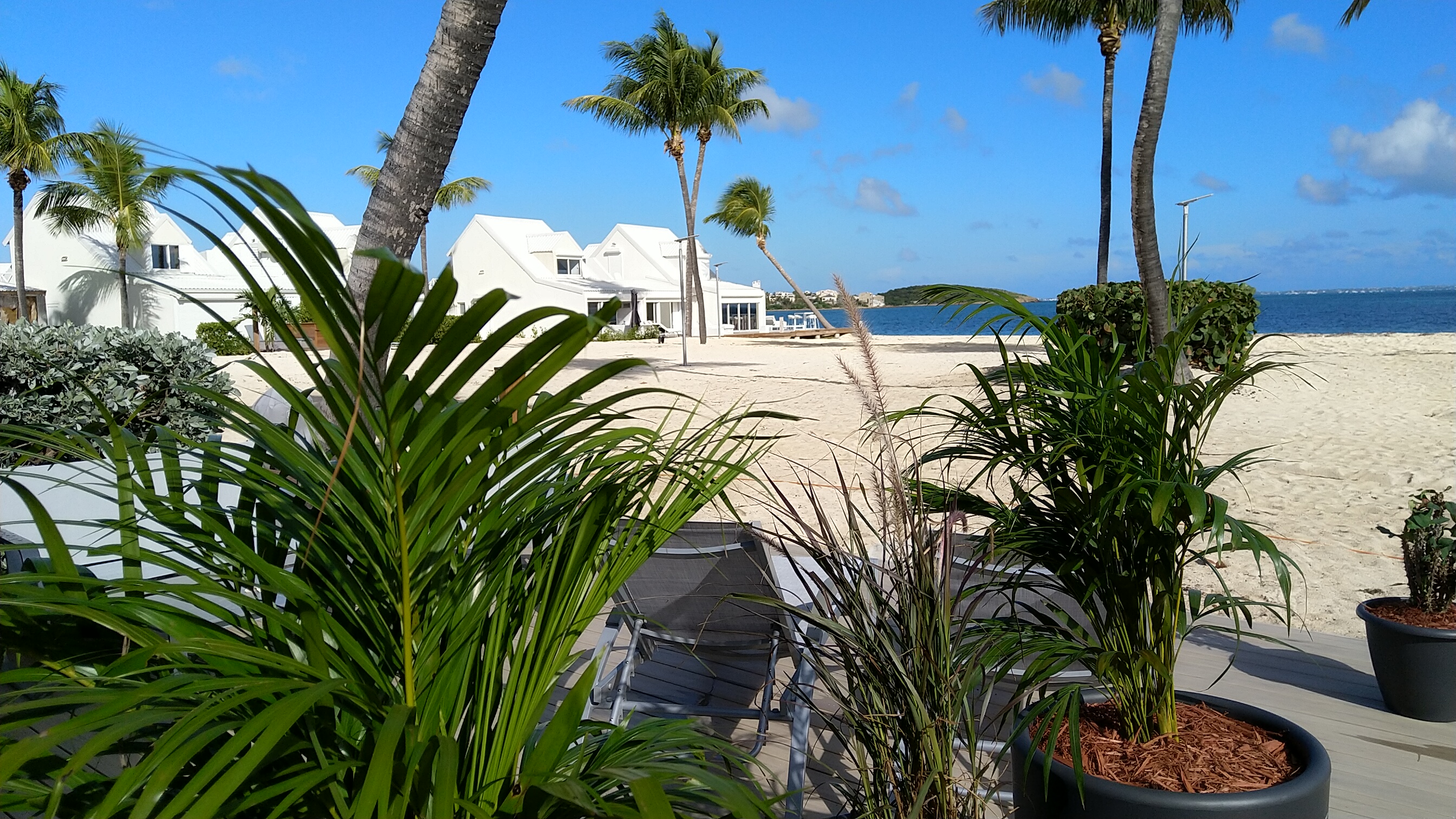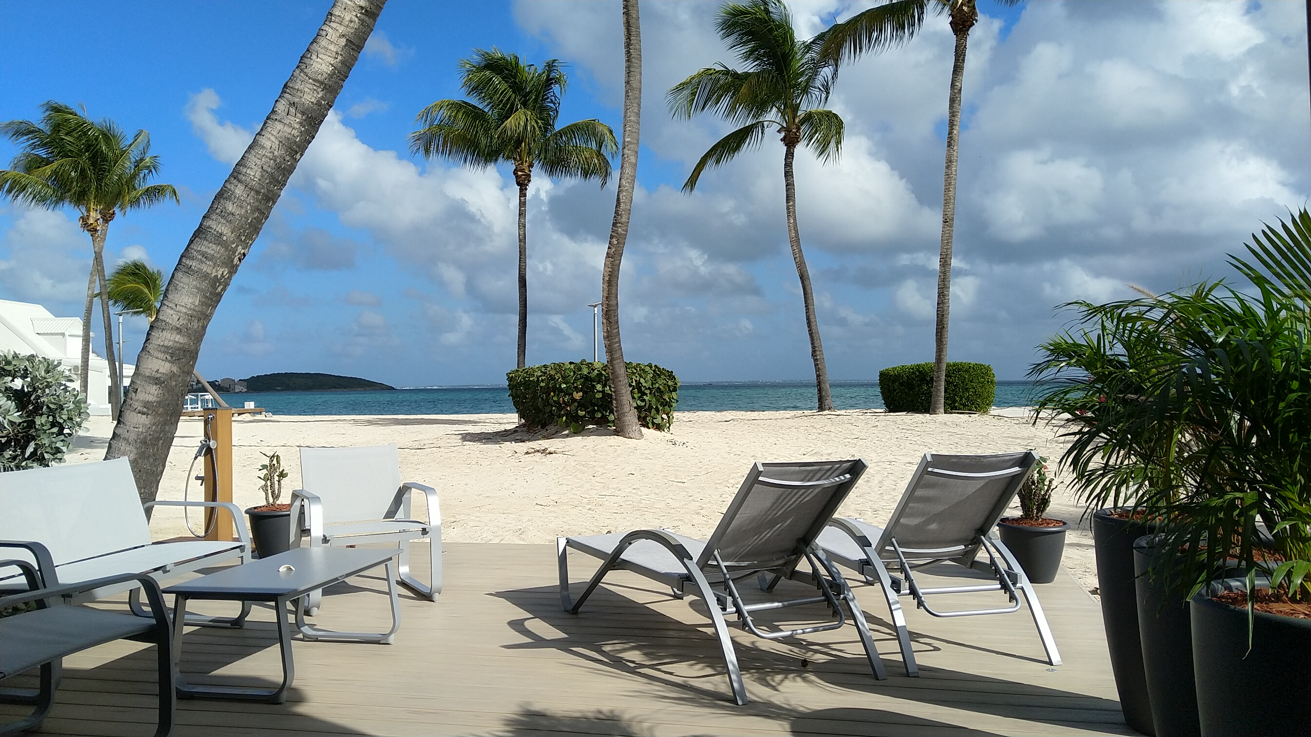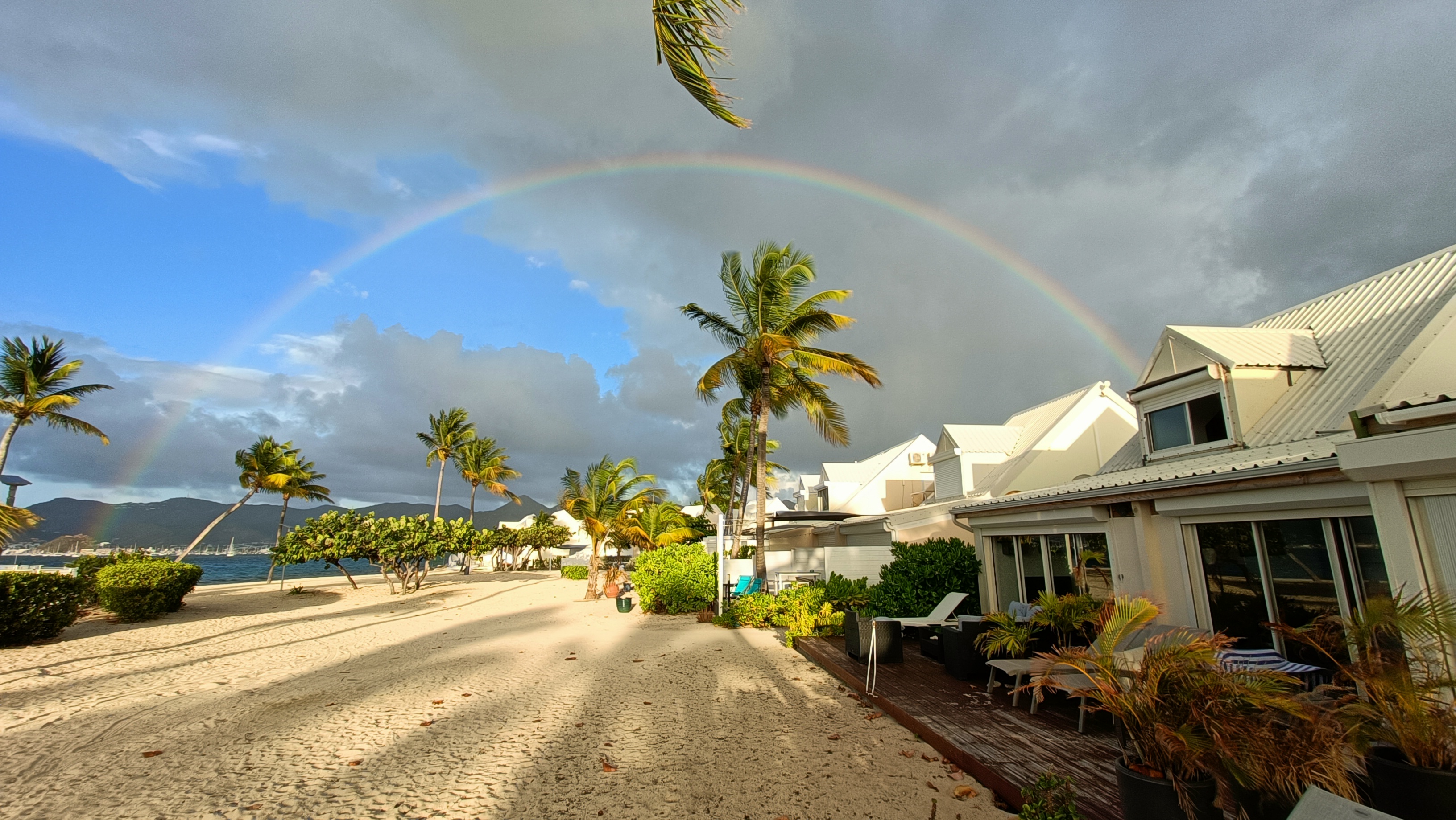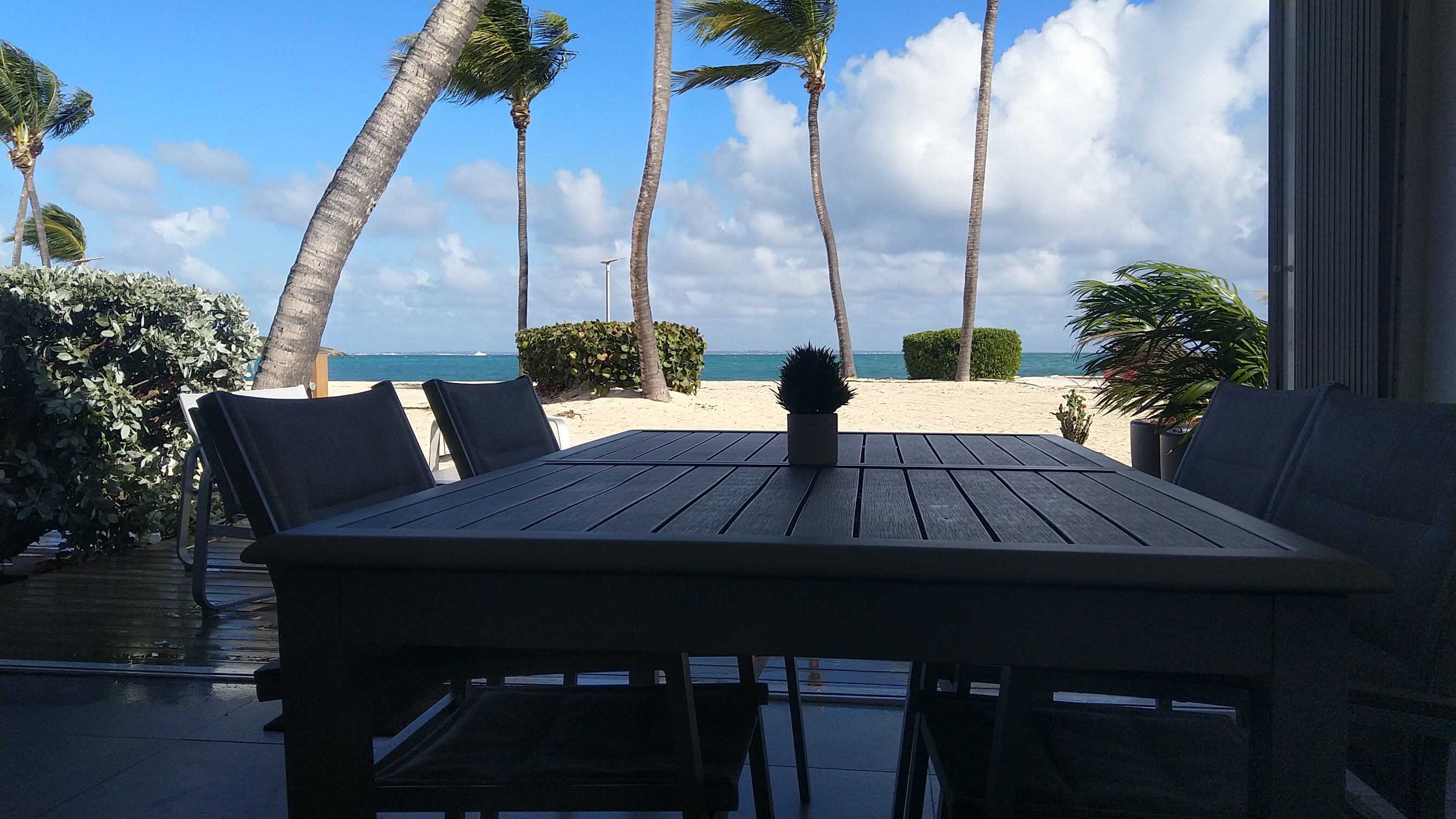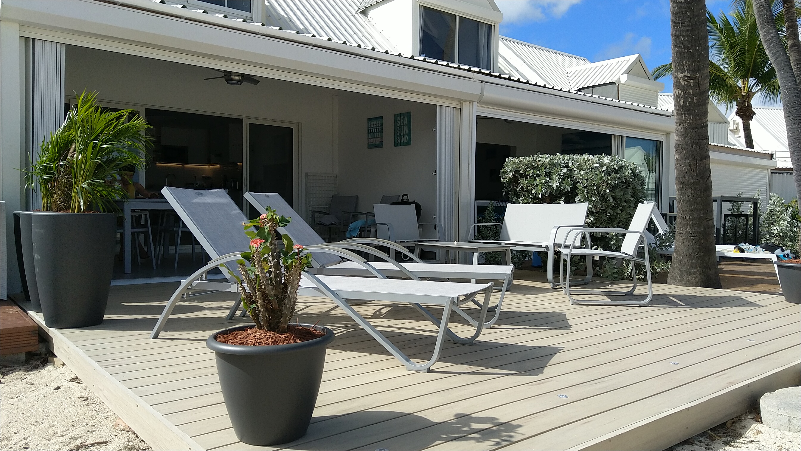 Face à la mer, votre maison duplex sur la plage de Baie Nettlé, comprend un total de 7 couchages, un grand salon/cuisine, une salle à manger sous la terrasse couverte, deux chambres, deux salles de bains, WC, solarium à l'étage et deck sur le sable...